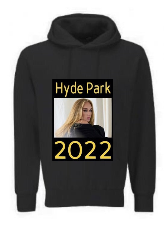 Black Hoodie with Adele 2022 Hyde Park and the option for Adele Wording across the back S 36/38" M 38/40" L 40/42" XL 42/44" 2XL 44/46" 3XL* 46/48" 4XL* 48/50"