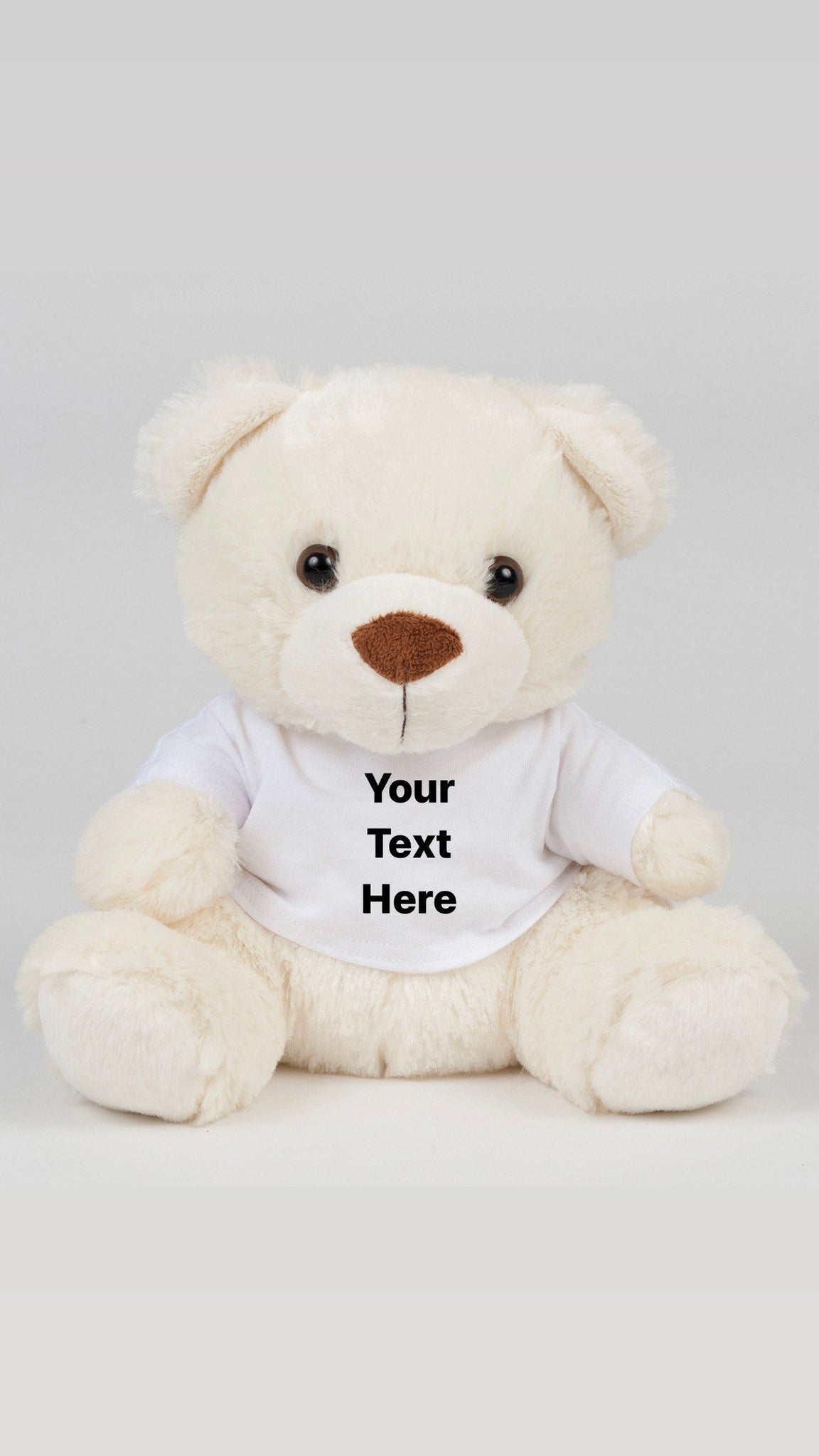 Mumble Teddy with a personalised Teeshirt. Available in 2 colours Cream or Brown and 2 sizes Small 20cm and Medium 30cm